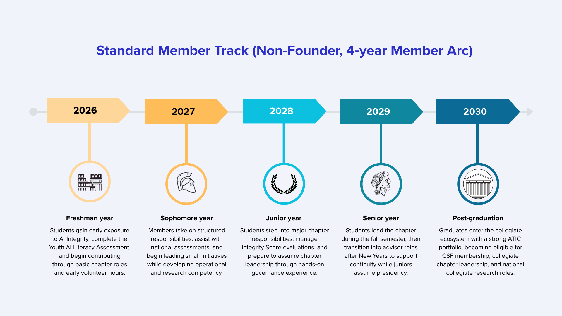 Sophomore Year The founder now leads early operations, manages small initiatives, and begins formal Integrity and assessment responsibilities.